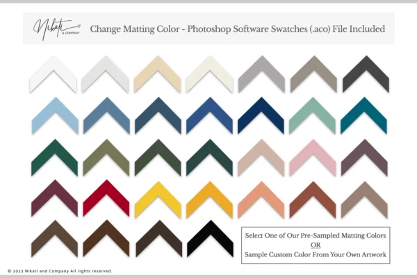 Create stunning and elegant deckle edge (torn paper) and straight edge float framed mockups using this kit along with one of our frame template kits (sold separately) or frame templates you already own. This is our favorite way to display our own artwork, and this kit helps us show our own customers what their custom float framed art will look like prior to purchase. Customize the print border width, choose no border at all, and easily test out different reveal mat color using the included swatches (.aco) file. The colors in the swatches file are close to those offered by popular print labs/framers.
